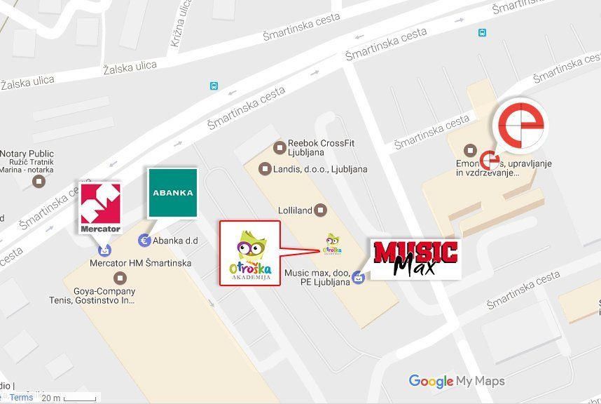 Nahajamo se čisto ob glavni cesti. Otroška akademija, Šmartinska cesta 106, 1000 Ljubljana (poleg poslovne stavbe Emona in med Mercatorjem). Naš vhod je obarvan zelene barve (pojdite mimo drsnih vrat v prvo nadstropje in se držite leve – imamo označevalne table).